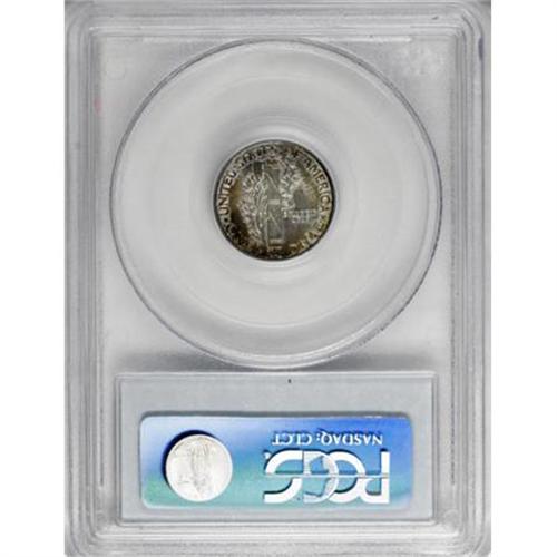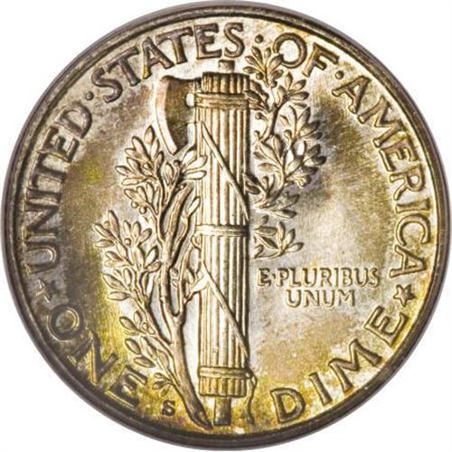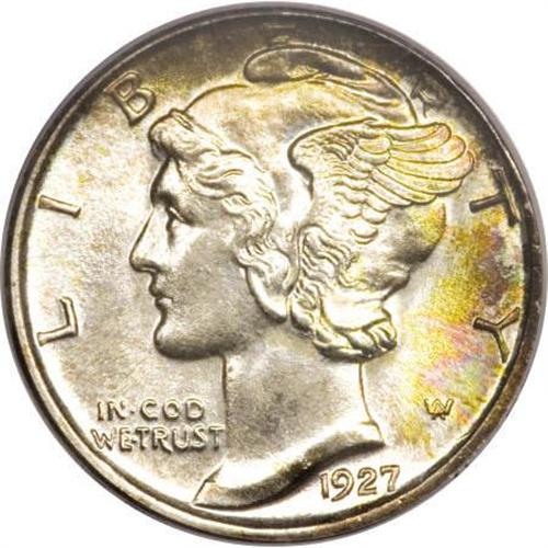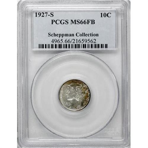 <B>1927-S 10C MS66 Full Bands PCGS.</B></I> This outstanding Premium Gem is tied for the finest Full Bands survivor certified by PCGS (12/07). The shining surfaces host devices that are solidly impressed at both the centers and the peripheries. The margins show elements of tan, bronze, and violet patina, while the remainder of each side is essentially brilliant. Powerful visual appeal for this San Francisco issue.<BR> Paradoxically, while Lange compares the 1927-S favorably to earlier S-mint dimes, he notes that the 1927-S pieces are far more elusive with Full Bands, and combined with a low general mintage and a tiny pool of Mint State pieces, the Full Bands coins for the year are particularly challenging. An attractive and carefully preserved representative such as the present exemplar should draw the attention of dedicated connoisseurs.<BR><I>From The Scheppman Collection, #4 PCGS Registry of Full Band Mercury Dimes.</B></I><BR><BR><B>Coin Engraver:</B> Adolph A. Weinman<BR><BR><b>Shipping:</b> Coins & Currency (<a target="_blank" href="http://www.heritageauctions.com/common/shipping.php">view shipping information</a>)