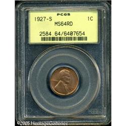 <B>1927-S 1C MS64 Red PCGS.</B></I> Bright orange and red coloration with a few grade-limiting specks of carbon. A scarce and seldom-seen S-mint cent with full red color. Lot:5502