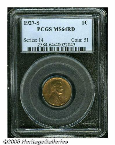 <B>1927-S<1C> MS64 Red PCGS.</B></I> Coppery-gold patina overlays highly lustrous surfaces that exhibit sharply struck design elements, though the S in STATES and the AMER of AMERICA are soft. There are no mentionable contact marks, but a few flecks are scattered over each side, particularly on the reverse. The '27-S is a scarce date with original Red color. Population: 103 in 64, 16 finer (3/05).