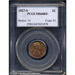 <B>1927-S 1C MS64 Red PCGS.</B></I> Somewhat softly struck with two or three contact marks on the reverse, and vague hints of dappled purple toning near the lower obverse borders. A scarcer date at this grade level. Lot:5504