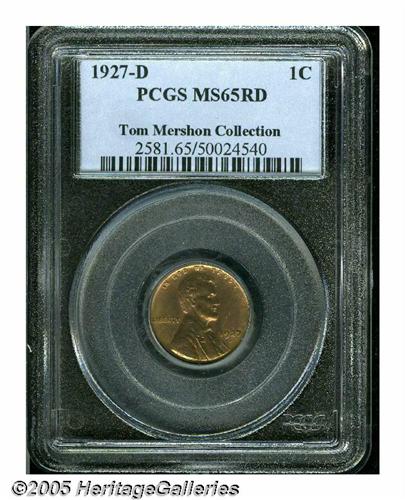 <B>1927-S<1C> MS65 Red PCGS.</B></I> A long respected issue among Lincoln Cents that is not only a condition rarity, but a strike rarity as well. Although over 14 million pieces were originally produced, in better Mint State grades the 1927-S is nearly on equal footing with the lower mintage 1926-S and, of course, is much scarcer than its famous Depression Era cousin, the 1931-S. While quite well defined for the issue, the standout feature of this rarely offered Gem is its radiant luster. Both sides are accented in sprinkles and splashes of orange-rose patina. Population: 16 in 65, 0 finer (3/05).<BR><I>From The Tom Mershon #2 All-Time PCGS Registry Set of Lincoln Wheat Cents.</B></I>