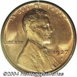 <table><tr><td><table><tr><td>1927-S 1C MS65 Red PCGS. Close examination with a magnifier reveals a few tiny abrasions, but as copper collectors know, this is a minor consideration on a coin such as this where color and overall preservation of surfaces are so important. The obverse has cherry-red coloration around the margins with steel-blue central color in the center, while the reverse is almost completely cherry-red. Sharply struck as well. The 1927-S is a very challenging issue to locate in top condition and few examples are known that would qualify for admission into one of the top quality (Registry) sets being assembled today. To put the matter in dollar and cents perspective, the last PCGS certified Gem we sold was in our FUN Sale this year, and that coin brought an astonishing $24,725. Population: 16 in 65, 0 finer (3/04). <BR><BR><B>Important notice:</B> Heritage usually auctions material at the rate of 200-250 lots per hour. On some occasions eBay Live bid software or the Internet may not be able to keep up with the pace of the auction. We recommend placing a realistic absentee bid now as insurance to avoid disappointment. Occasionally the auctioneer may eliminate or reject an eBay Live bid, and the auctioneer may also reopen a lot after the close of the eBay live bidding (usually because we missed an audience bid), and may reject your bid even if it shows you as the winning bidder. By bidding via eBay Live, you agree that Heritage may award the lot to another bidder at its sole discretion under the circumstances described above or any other reasonable circumstances. Since eBay bids are not shown to us until we open the lot on the floor, we treat those bids just like floor bids. In most cases the floor responds before the eBay bid is presented to us, due to Internet lag time, so for consistency we have made it a policy that floor bids are always considered first over tie eBay live bids. Also please note that all Heritage lots purchased through eBay Live carry a 20% Buyer's Premium. Please make sure you read the Terms and Conditions before you bid. <BR><BR><B>IMPORTANT ANNOUNCEMENT ABOUT RESERVES:</B> Heritage now divulges all reserves on its web site 7 days before every auction. If you want to know whether the reserve on this lot has been met, and if not, what the reserve amount is, please visit this lot page on the HeritageCoin.com web site, or email: bid@HeritageGalleries.com </span></font></td></tr></table></td></tr></table>
