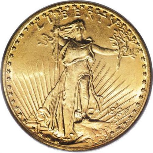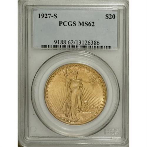 <B>1927-S $20 MS62 PCGS.</B></I> This interesting exemplar offers substantial visual appeal. The devices show a number of markers for the issue, including a degree of beveling on the reverse rim and minor softness at the obverse margins. Still, the overall level of detail is pleasing. Both sides offer strong, shining luster, with the slightly hazy honey-gold of the obverse giving way to butter-yellow shades on the reverse. Though a number of light flaws are present in the fields and a handful of abrasions are present on Liberty's legs and her upper tunic, the coin's overall appearance is above-average for the grade assigned. While MS62 pieces enjoy limited availability on the open market, aiming for anything finer substantially increases the cost and the time between auction appearances.<BR> The 1927-S double eagle, like other late-date mintmarked issues for the series, is elusive today. Despite San Francisco's output of over 3.1 million pieces, most scholarly estimates list fewer than 200 survivors. The mass melting of American gold coinage during the Roosevelt presidency claimed the vast majority of the mintage; unlike the Philadelphia examples from that year, few S-mints were shipped overseas. A pleasing representative is essential to the ambitious Saint-Gaudens enthusiast, and its presence adds instant cachet to any collection. As Q. David Bowers (2004) wrote in his <I>Guide Book of Double Eagle Gold Coins, </B></I>"The ownership of a fine 1927-S is a badge of accomplishment." Population: 27 in 62, 34 finer (10/07).<BR><I>From The Chicago Collection of Saints.</B></I><BR><BR><B>Coin Engraver:</B> Augustus Saint-Gaudens<BR><BR><b>Shipping:</b> Coins & Currency (<a target="_blank" href="http://www.heritageauctions.com/common/shipping.php">view shipping information</a>)