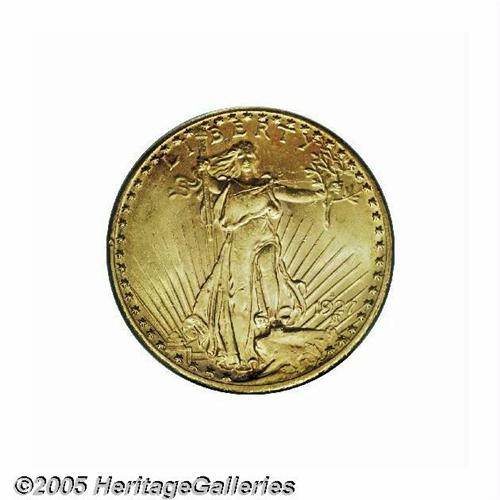 <B>1927-S<$20> MS63 PCGS.</B></I> During the 1940s, collectors regarded this issue as the fourth rarest Saint-Gaudens Double Eagle after only the 1924-S, 1926-D, and 1926-S. As gold specialists know all too well, the shipments of gold coins that returned to the United States from Europe since the 1950s have substantially reordered the rarity scale among later issues in this series. Despite the emergence of a few examples of this issue, however, numismatists generally believe that there are no more than sixty Mint State specimens extant today.<BR> While the majority of these pieces are marred by unsightly spots and/or heavy bagmarks, this Select specimen is certainly among the more attractive representatives of its issue. In fact, a couple of marks on Liberty's leg and the eagle's feathers are the only disruptions worthy of note on the otherwise smooth faces. The strike is noteworthy for its strength with abundant frosty brilliance over both the fields and the devices. Both the obverse and reverse exhibit soft peripheral shadings of green-gold coloration. In addition to the overall rarity of its issue, therefore, this piece is also significant among gold enthusiasts as a memorable condition rarity that is worthy of a equally memorable bid. Population: 22 in 63, 13 finer (5/05).