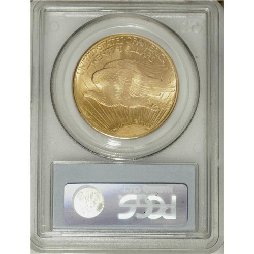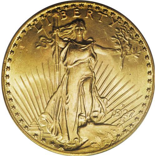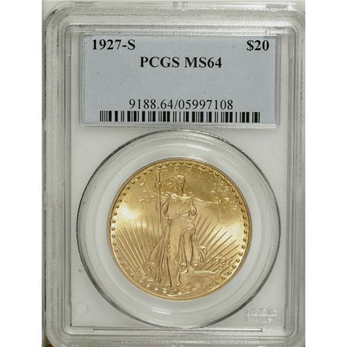 <B>1927-S $20 MS64 PCGS.</B></I> During the 1940s, specialists in United States gold assigned an extremely high rarity ranking to the 1927-S, behind only the 1924-S, 1926-D, and 1926-S. Of course, why the 1927-D was not included among the top four Saint-Gaudens issues is a bit perplexing. Shipments of gold coins that returned to the United States from Europe since the 1950s have substantially reordered the rarity scale among later issues in this series. Despite the emergence of a few examples of this issue, however, numismatists generally believe that there are no more than 80-100 Mint State specimens extant today. While the majority of these pieces are marred by unsightly carbon spots and/or heavy bagmarks, this lovely near-Gem is certainly among the more attractive representatives of its issue. In fact, a small, shallow lamination within the left obverse field and the characteristic circular die crack that joins LIBERTY to the date are the only disruptions worthy of note on the otherwise smooth faces. The strike is noteworthy for its strength with abundant frosty brilliance over both the fields and the devices. The obverse of this specimen displays vibrant orange-gold toning with soft undertones of green-gold coloration. The reverse, on the other hand, carries a warm blanket of copper-gold patination that recedes slightly to yellow-gold in the field about the eagle's head. Population: 5 in 64, 9 finer (11/06).<BR><BR><b>Shipping:</b> Coin/Currency (<a target="_blank" href="http://www.heritageauctions.com/common/shipping.php">view shipping information</a>)