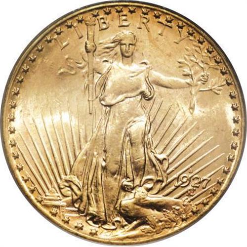 <B>1927-S $20 MS64 PCGS.</B></I> The Great Recall of 1933-1934, when President Franklin D. Roosevelt ordered the United States off of the gold standard, resulted in massive meltings of Saint-Gaudens double eagles. Some of the most beautiful coins ever minted were systematically converted from works of art into mundane gold bars, many of which are still stored in government vaults at Fort Knox, Kentucky. The later dates in the series were most affected by the meltings, as many were still in government possession at the time of the recall. As such, numerous recorded mintage figures of gold coins struck during the 1920s and 1930s are completely useless when trying to ascertain the rarity of a particular issue. Ironically, it was Franklin Roosevelt's fifth cousin, President Theodore Roosevelt, who commissioned Augustus Saint-Gaudens to create new designs for our country's circulating gold coinage. <BR> Breen suggested that only 15 examples of the 1927-S twenty were in existence when he published his landmark <I>Complete Encyclopedia</B></I> in 1988. That number seems ridiculously low based on our knowledge of this issue today. However, it may not have been too far off when Breen was researching Saint-Gaudens double eagles for inclusion in his seminal reference. Apparently more examples have been repatriated from European holdings since then. Yet even today the survival rate for this date is very low. In <I>The Coinage of August Saint-Gaudens</B></I> (Ivy Press, 2006) the authors comment of this rare issue: "The key status of the 1927-S is based on absolute rarity rather than conditional rarity. In all grades, there are probably only 160-170 pieces extant today, but curiously, two-thirds of the pieces known are Uncirculated." As with all '27-S Saints we have handled, the mint luster is thick and frosted. The bright surfaces have a noticeable overlay of reddish patina that deepens even more around the margins. Fully struck. There are a few scattered marks on each side, none of individual note, that keep this coin from an MS65 grade. Population: 5 in 64, 8 finer (8/07).<BR><BR><BR><B>Coin Engraver:</B> Augustus Saint-Gaudens<BR><BR><b>Shipping:</b> Coins & Currency (<a target="_blank" href="http://www.heritageauctions.com/common/shipping.php">view shipping information</a>)