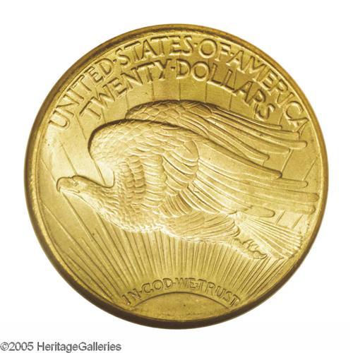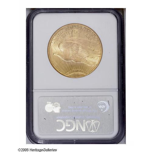 <B>1927-S<$20> MS66 NGC.</B></I> The higher Mint State grades of the 1927-S are quite rare. NGC and PCGS, for example, have certified a total of six '27-S examples in MS66, and a mere three coins grade finer 10/05). Indeed, only four specimens grading MS66 have made auction appearances at major sales in the past ten or so years, and one piece grades higher.<BR> The coin offered in this lot possesses a wonderful mix of apricot and yellow-gold patination, and exhibits vibrant luster. The design elements are exceptionally well struck, though the Capitol reveals minor softness. It is devoid of significant marks, save for an inoffensive shallow linear abrasion on Liberty's chest. Interestingly though, a mint made "scrape" on the sun is noted (we have recently seen another 1927-S twenty with the same feature, leading one to believe that the two coins in question were struck from the same reverse die within a relatively short period of time. Perhaps the parent die was over polished in this area). This is a magnificent specimen that is sure to generate spirited bidding. Population: 4 in 66, 2 finer (10/05).<BR><I>From The Phillip H. Morse Collection of Saint-Gaudens Coinage, Part Two.</B></I>