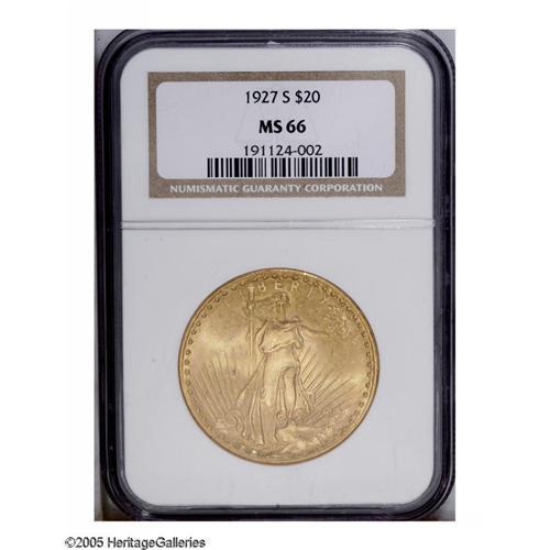 1927-S $20 MS66 NGC. Pop: (P 2/1, N 4/2). Mintage: 3,1 1927-S[$20] MS66 NGC.