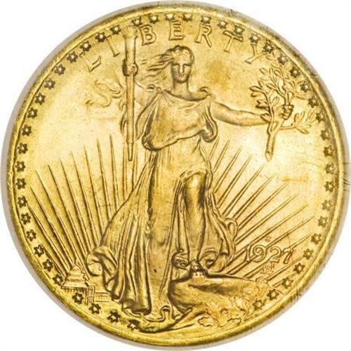 <B>1927-S $20 MS66 NGC.</B></I> In 1927, the Roaring Twenties were in full steam, and signs of commercial progress flourished. The trans-Atlantic flight of Charles Lindbergh inspired millions on both sides of that ocean; just a few months earlier, the first trans-Atlantic telephone call took place between New York and London. Under famously business-friendly President Calvin Coolidge, whose Cabinet included then-Commerce Secretary Herbert Hoover, the American economy not only rebounded from the post-war recession of the Harding Administration, it soared to dizzying heights; the economies of European nations rose alongside that of the United States, and the "Golden Twenties," as some called them, saw flourishing markets and renewed financial strength emerge from the ruins of the Great War. By 1927, the flow of gold from the United States to the vaults of Switzerland and other nations was emblematic of the developed world's economic interdependency. These gold coins, though, were largely from Philadelphia, since that Mint was closest to the Eastern seaboard and thus most convenient for trans-Atlantic traders. By contrast, the branch mint issues from Denver and San Francisco rarely entered the commercial mainstream.<BR> Like many other issues in the Saint-Gaudens series from the 1920s and 1930s, the 1927-S had a substantial mintage. In this case, 3.1 million pieces were produced at the San Francisco Mint for the year; this figure is slightly greater than that of the 1927 P-mint issue, now one of the most popular type coins for the series. However, almost the entire mintage was melted in the 1930s. In the 1940s the 1927-S was considered the fourth scarcest issue in the series and was thought to be even more elusive than the 1927-D. In the 1950s that perception began to change, however, as one or two pieces at a time began to show up in European gold holdings. But, like the 1926-D, it never appeared in any quantity. Very few examples are known today in all grades, and it is always a focal point of any auction. In his 1988 book, <I>A Handbook of 20th Century United States Gold Coins,</B></I> David Akers ranked the 1927-S as tenth of the 54 issues in the series in overall rarity, and 14th in the series in MS64 or better grades. While Garrett and Guth (2006) fail to assign a specific rank to the 1927-S, they emphasize the challenge it poses, particularly in better grades; in reviewing survivors, they note that " ... most are in lower Mint State grades or show minor evidence of brief circulation."<BR> This is a superlative example, and even a casual glance shows that this coin is decidedly better than MS65. The surfaces display bright satiny mint luster and are well struck throughout. Close examination with a magnifier shows a couple of shallow marks on each side, but one would be hard pressed to find any that could be used as pedigree identifiers. The coin has a lovely orange-gold coloration with a faint trace of lilac interspersed. This piece was struck from an intermediate die state; there is just the slightest evidence of die bulging evident below the lettering in LIBERTY on the obverse, and a die crack runs through the eagle's beak on the reverse.<BR> Only a small handful of 1927-S twenties are known today better than MS65. The combined certified population shows just six examples in MS66, four at NGC and two at PCGS, with only three coins finer, two in NGC holders and one PCGS-certified (11/07). Though Heritage auctions have presented several opportunities to acquire a Premium Gem representative of this elusive issue over the past several years, this is due to the unlikely confluence of multiple important gold collections in that timeframe, the Morse and Kutasi collections among them, and the rate at which examples have been offered has ebbed. It is entirely possible that years could pass before the opportunity to purchase a 1927-S double eagle of this caliber comes again.<BR><I>From The Jacob Collection of Saint-Gaudens Double Eagles.</B></I><BR><BR><B>Coin Engraver:</B> Augustus Saint-Gaudens<BR><BR><b>Shipping:</b> Coins & Currency (<a target="_blank" href="http://www.heritageauctions.com/common/shipping.php">view shipping information</a>)
