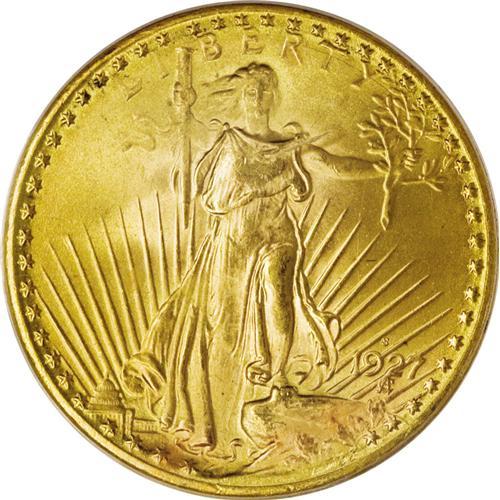 <B>1927-S $20 MS66 PCGS.</B></I> The 1927-S double eagle stands out as one of the rarest and best-known issues of the Saint-Gaudens series, despite the fact that 3.1 million pieces were produced. The key status of the '27-S is based on absolute rarity rather than conditional rarity. PCGS and NGC have certified about 220 examples in all grades, some of which are undoubtedly resubmissions. David Akers, in his cataloging of the May 19, 1998 sale of the Dr. Thaine Price Collection, says: "The 1927-S double eagle is one of the most revered issues in the Saint-Gaudens double eagle series, and most known specimens are either high grade circulated examples or low grade Mint State pieces. Choice and Very Choice Uncirculated 1927-S double eagles are very rare and Gems are extremely rare. Looking back in history to the late 1940's and early 1950's, the 1927-S occupied an even more exalted position in the series than it does today. At that time, it was generally regarded as the fourth or fifth rarest issue in the series after the 1924-S, 1926-D and 1926-S, more or less on a par with the 1931-D. It was then considered to be even more rare than the 1927-D, which today is regarded as the premier issue in the series, as well as such now famous issues as 1920-S, 1921, 1930-S, 1931 and 1932. However, as was the case with many of the Saint-Gaudens issues that were thought to be ultra-rare, a small number of 1927-S double eagles trickled out of European banks over the next 20 years, although no really substantial quantities of this issue were ever found. Nevertheless, enough 'new' specimens came onto the market to reduce its overall rarity level from 'extremely rare', as was described by B. Max Mehl in the famous Dr. Charles W. Green sale in 1949, to the 'rare' status it holds today. In Gem condition, however, and especially in the superb condition represented by this specimen (the PCGS-graded MS66 coin in the Price sale), Mehl's earlier 'extremely rare' description of the 1927-S is still valid." The population data corroborate Akers' assessment of the rarity level of high-end Uncirculated examples of the 1927-S. Only 11 coins have been graded MS65, six specimens have been assigned MS66, and a mere three pieces rated MS67.<BR> The presently-offered Premium Gem displays peach-gold patina that is accompanied on the obverse by tinges of light tan, and on the reverse by subtle yellow-green undertones and occasional splashes of orange color. Attractive luster radiates from both faces, and the motifs are well impressed. The Capitol building, which is typically weak on this issue, exhibits nice detail in most of the panes. Liberty's facial features, the fingers on both hands, the toes, and the eagle's plumage are all sharp. A solitary light copper spot in the lower left obverse field and a small mark in the middle of Liberty's outstretched left arm may help in the coin's pedigree. This outstanding piece is sure to generate spirited bidding among aficionados of rare-date Saint-Gaudens coinage, and clearly one of the highlights among the double eagles of the Kutasi Collection. Population: 2 in 66, 1 finer (11/06).<BR><I>From The Kutasi Collection.</B></I><BR><BR><b>Shipping:</b> Coin/Currency (<a target="_blank" href="http://www.heritageauctions.com/common/shipping.php">view shipping information</a>)