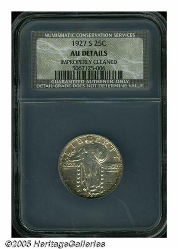 <B>1927-S<25C> AU Details, Improperly Cleaned, NCS.</B></I> A well defined example of this key, but marred by unnaturally bright surfaces that show hairlines over the reverse. Reddish-golden color.<BR><I>From The Empire State Collection.</B></I>