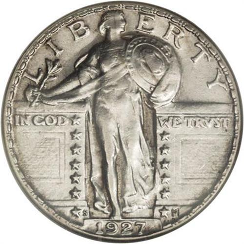 <B>1927-S<25C> AU55 NGC.</B></I> The mint luster is nearly complete, but a line of slight wear is detected on Liberty's open leg. Slate-gray in color with pleasantly unmarked surfaces. Struck from clashed dies, as made, a mint worker removed some of these from the gate beneath IN. Also, the reverse displays numerous die polish lines, but several clash marks are still apparent. A low mintage collector favorite, and the key to the second half of the series.