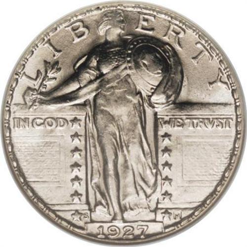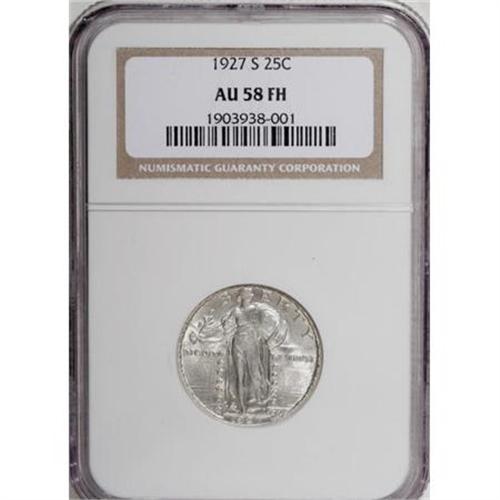 <B>1927-S 25C AU58 Full Head NGC.</B></I> With the second-lowest mintage among Standing Liberty quarters, it is unsurprising that the 1927-S is a premium issue in all grades. The 1927-S is not just popular for its low production, however; between a typically poor strike that yielded just comparatively few well-defined pieces, a low population of Mint State survivors resulting from low interest in saving examples of the year's coinage, and only gradual awareness of the issue's true importance, the result is fervent demand for the few high-end examples on the market today.<BR> While not Mint State, this delightful piece offers exceptional visual appeal. Aside from a touch of friction on Liberty's legs and the eagle's breast, the surfaces are largely unaffected by the brief time this coin spent in circulation, and the gold-kissed silver surfaces retain most of their original luster. The devices display above-average definition for the issue overall, and the head shows three olive leaves, a line separating the hair from the brow, and a tiny indentation at the ear. An interesting alternative to the elusive Full Head Mint State 1927-S and its substantially higher cost. Census: 3 in 58 Full Head, 16 finer (9/07).<BR><BR><B>Coin Engraver:</B> Hermon A. MacNeil<BR><BR><b>Shipping:</b> Coins & Currency (<a target="_blank" href="http://www.heritageauctions.com/common/shipping.php">view shipping information</a>)
