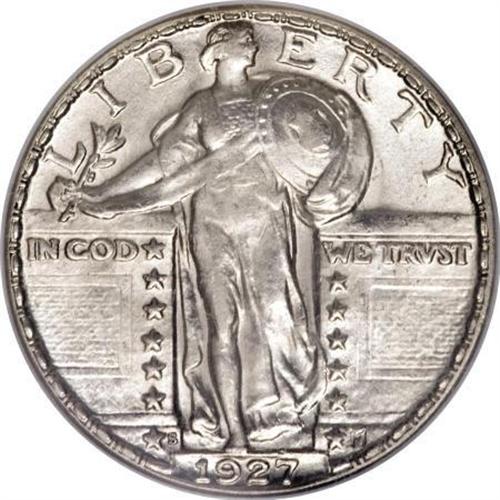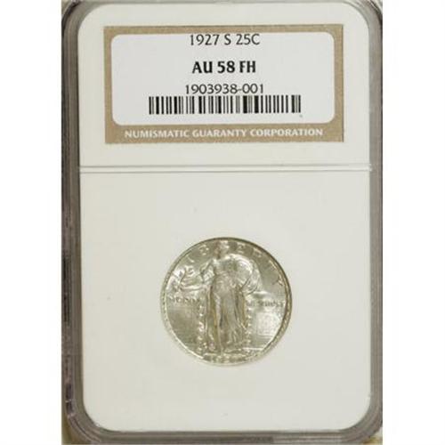 <B>1927-S 25C AU58 Full Head NGC.</B></I> With the second-lowest mintage among Standing Liberty quarters, it is unsurprising that the 1927-S is a premium issue in all grades. The 1927-S is not just popular for its low production, however; between a typically poor strike that yielded comparatively few well-defined pieces, a low population of Mint State survivors resulting from low interest in saving examples of the year's coinage, and only gradual awareness of the issue's true importance, the result is fervent demand for the few high-end examples on the market today.<BR> While not Mint State, this delightful piece offers exceptional visual appeal. Aside from a touch of friction on Liberty's legs and the eagle's breast, the surfaces are largely unaffected by the brief time this coin spent in circulation, and the gold-kissed silver surfaces retain most of their original luster. The devices display above-average definition for the issue overall, and the head shows three olive leaves, a line separating the hair from the brow, and a tiny indentation at the ear. An interesting alternative to the elusive Full Head Mint State 1927-S and its substantially higher cost. Census: 3 in 58 Full Head, 16 finer (3/08).<BR><BR><B>Coin Engraver:</B> Hermon A. MacNeil<BR><BR><b>Shipping:</b> Coins & Currency (<a target="_blank" href="http://www.heritageauctions.com/common/shipping.php">view shipping information</a>)