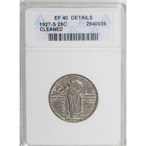 <B>1927-S 25C --Cleaned--ANACS. XF40 Details.</B></I> A nicely detailed example of the most famous condition rarity of the Standing Liberty series. This lightly worn piece has retoned gold and blue, though the surfaces have subdued, unnatural luster.<BR><BR><b>Shipping:</b> Coins & Currency (<a target="_blank" href="http://www.heritageauctions.com/common/shipping.php">view shipping information</a>)