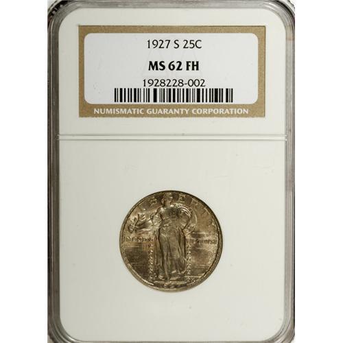 <B>1927-S 25C MS62 Full Head NGC.</B></I> Certain issues, such as the 1796 quarter and the 1901-S quarter, have unusual grade distributions, with many low-grade pieces known, as well as a quantity of high-grade pieces, but few in between. The 1927-S quarter is just such a coin, with most survivors grading less than Fine, but with several Mint State pieces. When an example in the latter category becomes available, it is subject to much demand as the large number of collectors that otherwise desire XF and AU grade pieces must compete for these lower level Mint State examples. This fully brilliant specimen has attractive light gray and heather color with frosty surfaces. It is a sharp strike in nearly every detail, with only slight weakness at the inner curve of the shield. Census: 2 in 62 Full Head, 12 finer (11/06).<BR><BR><b>Shipping:</b> Coin/Currency (<a target="_blank" href="http://www.heritageauctions.com/common/shipping.php">view shipping information</a>)