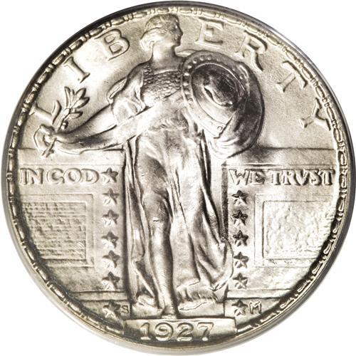 <B>1927-S 25C MS65 Full Head PCGS.</B></I> Only the 1916 quarter has a lower mintage than the 396,000 examples reported for the '27-S. Of course, the limited mintage of the 1918/7-S is probably lower, although an exact production figure for that variety is unknown. This example is impressive, not only for its full head, but also for its sharp shield definition, missing only two of the rivets, and for its full reverse definition with complete feather detail. It is a frosty and highly lustrous Gem with frosty silver surfaces and no trace of toning.<BR> The rarity of this issue in Full Head Gem is comparable to the rarity of similar-grade examples of the overdate, the 1924-D, and the 1926-D, and it is substantially rarer than the 1916. J.H. Cline, a specialist in the series and author of <I>Standing Liberty Quarters</B></I> (the fourth edition was published earlier this year), writes: "The 1927-S has such a low mintage that there are few Full Heads in existence. If all Full Heads had been withheld from circulation, it would still have been the scarcest S mint of the entire series excluding of course the 1918/7-S. I give the 1927-S a liberal estimate of one percent struck with Full Heads. That would leave about 3,900 that were struck with Full Heads. This number decreases considerably because, indeed, some did make it into circulation. Your author would rate it three to five times rarer than the 1916 in Full Head. With that said, the present price for a 1927-S FH is not in line with the real scarcity of the coin. In the 45 years your author has collected and admired these coins, the ratio I have observed is at least one 1927-S to twenty-five 1916s with Full Heads."<BR><I>From The Encinitas Collection.</B></I><BR><BR><b>Shipping:</b> Coins & Currency (<a target="_blank" href="http://www.heritageauctions.com/common/shipping.php">view shipping information</a>)
