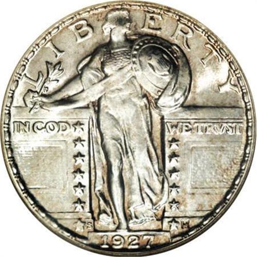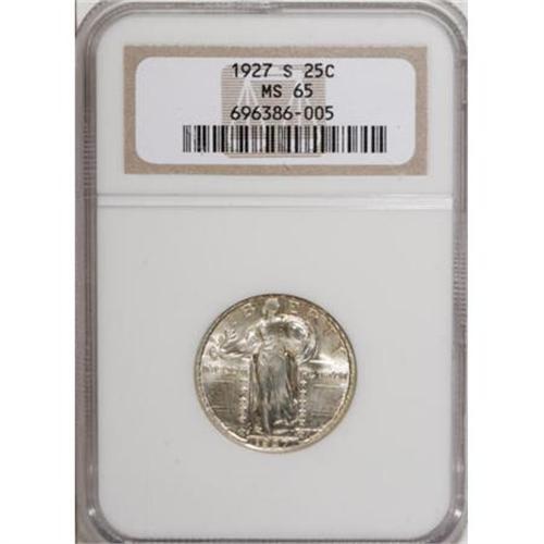 <B>1927-S 25C MS65 NGC.</B></I> The 1927-S is the key issue in the Standing Liberty quarter series. Only 396,000 pieces were struck, the second lowest mintage in the series, and it is very elusive in VF or better grades. In Uncirculated condition, it is several times rarer than the lower mintage 1916. On this Gem, perhaps half of the head detail is present and there is slight softness seen also on Liberty's shield and the eagle's breast. The mint luster is bright and the surfaces show no noticeable blemishes on either side. Almost brilliant, each side has just a hint of light golden patina around the margins. Census: 24 in 65, 27 finer (11/07).<BR><BR><B>Coin Engraver:</B> Hermon A. MacNeil<BR><BR><b>Shipping:</b> Coins & Currency (<a target="_blank" href="http://www.heritageauctions.com/common/shipping.php">view shipping information</a>)