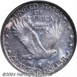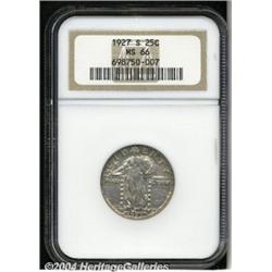 <B>1927-S<25C> MS66 NGC.</B></I> This lot offers a truly fine premium Gem representative of this important 20th century Quarter rarity. The surfaces are possessed of full luster that shines powerfully through warm, somewhat mottled, champagne-gray patina. Select angles also reveal olive-tinged rim accents, as well as a blush of powder-blue iridescence on the obverse, at the date. The strike, while not complete, is well above average for the type, and the surfaces do not reveal a single bothersome handling mark. Perfect for inclusion in an advanced Standing Liberty Quarter collection that highlights originality as well as rarity. Population: 21 in 66, 1 finer (7/04). <BR><BR><B>Important notice:</B> Heritage usually auctions material at the rate of 200-250 lots per hour. On some occasions eBay Live bid software or the Internet may not be able to keep up with the pace of the auction. We recommend placing a realistic absentee bid now as insurance to avoid disappointment. Occasionally the auctioneer may eliminate or reject an eBay Live bid, and the auctioneer may also reopen a lot after the close of the eBay live bidding (usually because we missed an audience bid), and may reject your bid even if it shows you as the winning bidder. By bidding via eBay Live, you agree that Heritage may award the lot to another bidder at its sole discretion under the circumstances described above or any other reasonable circumstances. Since eBay bids are not shown to us until we open the lot on the floor, we treat those bids just like floor bids. In most cases the floor responds before the eBay bid is presented to us, due to Internet lag time, so for consistency we have made it a policy that floor bids are always considered first over tie eBay live bids. Also please note that all Heritage lots purchased through eBay Live carry a 20% Buyer's Premium. Please make sure you read the Terms and Conditions before you bid. </span></font></tr></table></td></tr></table>