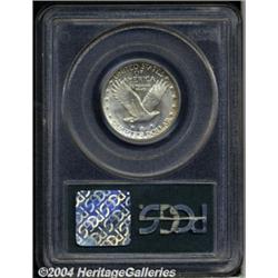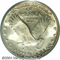 <B>1927-S<25C> MS66 PCGS.</B></I> With only 396,000 pieces produced, the 1927-S is the premier rarity among regular issue Standing Liberty quarters. It is even rarer than the 1916, even though almost eight times as many coins were struck as the 1916 was saved in rather substantial numbers. Apparently very few people thought to set aside Mint State quarters in 1927 from the San Francisco mint as not many are extant today. At the MS66 level, the 1927-S is one of the foremost condition rarities in all of 20th century U.S. numismatics. The surfaces on this piece sparkle with bright mint luster and, as one would expect, there are no abrasions evident. While not technically a Full Head coin, there are two distinct sprigs in Liberty's hair and the remainder of the head is complete except for the area around the ear. Mostly brilliant, there is just the slightest hint of golden color present on each side. An exceptionally well preserved example of this classic rarity and an excellent value. Encapsulated in a prior generation, green label PCGS holder. Population: 27 in 66, 4 finer (3/04). <BR><BR><B>Important notice:</B> Heritage usually auctions material at the rate of 200-250 lots per hour. On some occasions eBay Live bid software or the Internet may not be able to keep up with the pace of the auction. We recommend placing a realistic absentee bid now as insurance to avoid disappointment. Occasionally the auctioneer may eliminate or reject an eBay Live bid, and the auctioneer may also reopen a lot after the close of the eBay live bidding (usually because we missed an audience bid), and may reject your bid even if it shows you as the winning bidder. By bidding via eBay Live, you agree that Heritage may award the lot to another bidder at its sole discretion under the circumstances described above or any other reasonable circumstances. Since eBay bids are not shown to us until we open the lot on the floor, we treat those bids just like floor bids. In most cases the floor responds before the eBay bid is presented to us, due to Internet lag time, so for consistency we have made it a policy that floor bids are always considered first over tie eBay live bids. Also please note that all Heritage lots purchased through eBay Live carry a 20% Buyer's Premium. Please make sure you read the Terms and Conditions before you bid. </span></font></tr></table></td></tr></table>