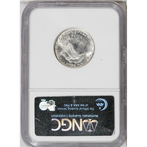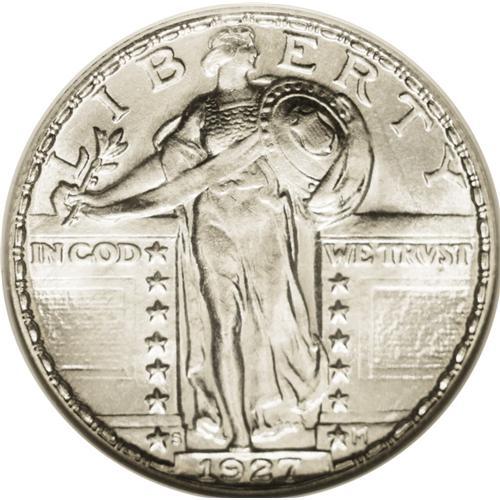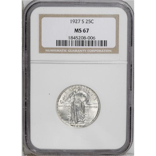 <B>1927-S<25C> MS67 NGC.</B></I> Astounding quality in this Superb Gem key date, and unsurpassable at either service, as both NGC and PCGS have each graded four pieces in this lofty MS67 grade level, with none higher (7/06). Each side is frosty and untoned, with just a glint of golden patina. But the blazing cartwheel luster and a near-total lack of mentionable abrasion are this coin's chief attributes. The head detail is fairly well struck, although short of a Full Head designation; this issue is notorious for a weak obverse strike, but this piece is a pleasing exception. The shield lines are soft, but all but three of the rivets are bold. Less than 1% of examples of this date are found with full head details, according to the Cline Standing Liberty quarter reference.<BR><I>From The Brevard Gold & Silver Former #2 NGC Registry of Standing Liberty Quarters.</B></I>