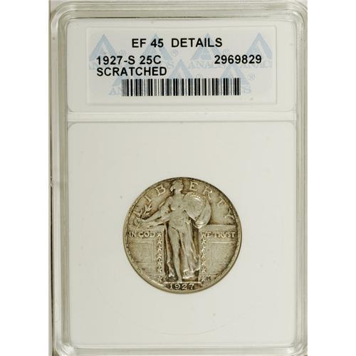 <B>1927-S 25C --Scratched--ANACS. XF45 Details.</B></I> Generally silver-gray, but tobacco-brown clings to recessed pockets of the design. The reverse has several pinscratches, but these are not particularly distracting. A low mintage collector favorite.<BR><BR><b>Shipping:</b> Coins & Currency (<a target="_blank" href="http://www.heritageauctions.com/common/shipping.php">view shipping information</a>)