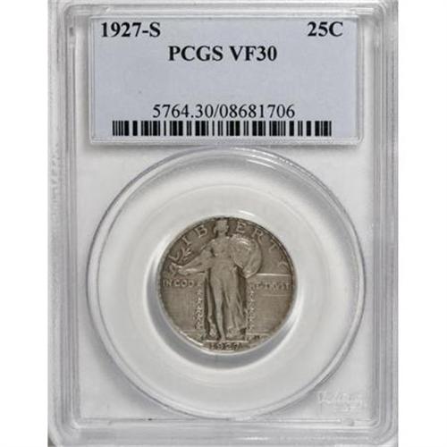 <B>1927-S 25C VF30 PCGS.</B></I> PCGS Population (62/537). NGC Census: (36/340). Mintage: 396,000. Numismedia Wsl. Price for NGC/PCGS coin in VF30: $505. (#5764)<BR><BR><B>Coin Engraver:</B> Hermon A. MacNeil<BR><BR><b>Shipping:</b> Coins & Currency (<a target="_blank" href="http://www.heritageauctions.com/common/shipping.php">view shipping information</a>)