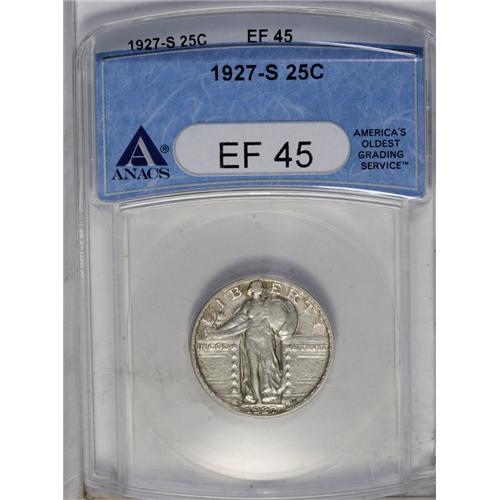 <B>1927-S<25C> XF45 ANACS.</B></I> A lovely example of this key-date issue, only lightly circulated. The surfaces have desirable light gray color with faint yellow and sea-green toning at the borders.