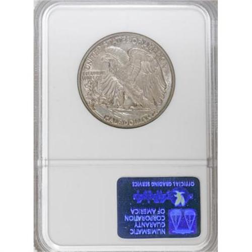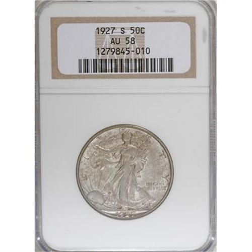 <B>1927-S 50C AU58 NGC.</B></I> Dappled sky-blue and violet toning graces the softly lustrous surfaces of this delightful piece. Swirling luster invigorates the fields, and the pleasingly detailed devices show just a trace of friction.<BR><BR><B>Coin Engraver:</B> Adolph A. Weinman<BR><BR><b>Shipping:</b> Coins & Currency (<a target="_blank" href="http://www.heritageauctions.com/common/shipping.php">view shipping information</a>)