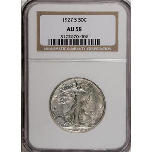 <B>1927-S 50C AU58 NGC.</B></I> Soft, pleasing luster and few marks of significance. While the central devices show typical softness, the peripheral elements show better definition. Overall, a pleasing coin.<BR><BR><B>Coin Engraver:</B> Adolph A. Weinman<BR><BR><b>Shipping:</b> Coins & Currency (<a target="_blank" href="http://www.heritageauctions.com/common/shipping.php">view shipping information</a>)