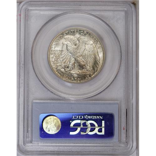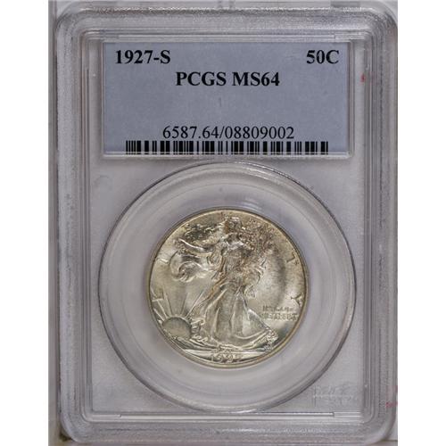<B>1927-S<50C> MS64 PCGS.</B></I> Lustrous and typically struck, with light golden-silver toning and a partial coating of speckled russet-red patina on each side. Since the 1927-S was the first half dollar produced since 1923, it stands to reason that most of the 2.3 million coins delivered were desperately needed in the channels of commerce. Indeed, this issue is only really common in grades below the XF level.<BR><I>From The Big Tex Registry Set of Walking Liberty Halves.</B></I>