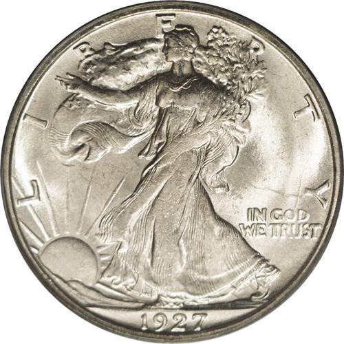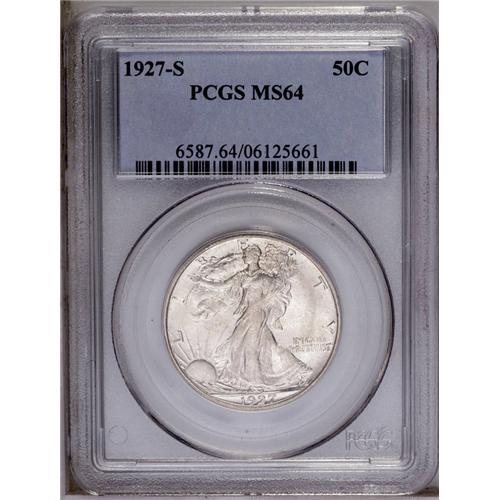 <B>1927-S<50C> MS64 PCGS.</B></I> Lustrous and untoned with well defined central devices for this normally substandard 1920s San Francisco issue. A faint pinscratch runs horizontal across from the Y in LIBERTY, the most obvious deterrent to a Gem rating. <BR><BR><B>Important notice:</B> Heritage usually auctions material at the rate of 200-250 lots per hour. On some occasions eBay Live bid software or the Internet may not be able to keep up with the pace of the auction. We recommend placing a realistic absentee bid now as insurance to avoid disappointment. Occasionally the auctioneer may eliminate or reject an eBay Live bid, and the auctioneer may also reopen a lot after the close of the eBay live bidding (usually because we missed an audience bid), and may reject your bid even if it shows you as the winning bidder. By bidding via eBay Live, you agree that Heritage may award the lot to another bidder at its sole discretion under the circumstances described above or any other reasonable circumstances. Since eBay bids are not shown to us until we open the lot on the floor, we treat those bids just like floor bids. In most cases the floor responds before the eBay bid is presented to us, due to Internet lag time, so for consistency we have made it a policy that floor bids are always considered first over tie eBay live bids. Also please note that all Heritage lots purchased through eBay Live carry a 20% Buyer's Premium. Please make sure you read the Terms and Conditions before you bid. This lot is being auctioned in conjunction with a live floor auction by Heritage Galleries & Auctioneers. All final auction and invoice information will be supplied by Heritage Galleries & Auctioneers, and all other information should be considered preliminary. Lot:2933 <BR><BR><B>Winning Notification and Billing:</B> After the FINAL session in this auction is complete, Heritage will send e-mail and snail mail invoices. This process normally takes several days. All final auction and invoice information will be supplied by Heritage Galleries & Auctioneers, and all other information should be considered preliminary. <BR><BR>This auction will be conducted on a live auction floor and over the Internet through eBay Live. If you choose to place an absentee bid, please take a moment to <font color='#0000ff'><u><a href='http://pages.ebay.com/liveauctions/help/before/laabsentee.html'>learn how eBay Live absentee bidding works</a></u></font><font color='#000000'>