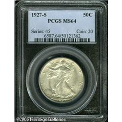<B>1927-S 50C MS64 PCGS.</B></I> One of only five half dollar issues between 1922 and 1932, the 1927-S most likely saw extensive circulation throughout the late 1920s and early 1930s. The scarcity of Gem quality examples enhances the desirability of attractive near-Gems such as this silver-gray survivor. Typically struck for an S-mint Walker, the surfaces are predominantly smooth with a pleasing satiny finish. Some central weakness of strike seems to be the only distraction that separates this example from an even higher grade. Lot:8002
