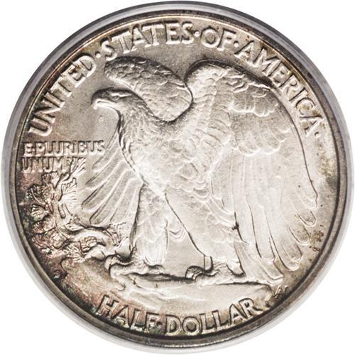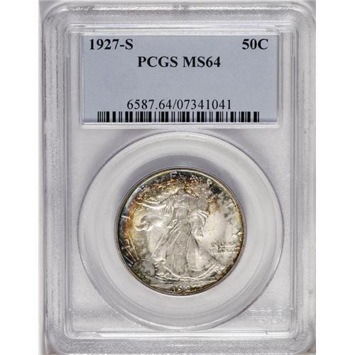 <B>1927-S<50C> MS64 PCGS.</B></I> Scintillating peripheral iridescence of ice-blue, amber, and russet is the hallmark of this splendid near-Gem specimen. The reverse center is brilliant, while the obverse center has a light silver-gold cast. Perusal with a loupe reveals no mentionable abrasions, although some interesting die cracks are seen on the lower-reverse devices along with some obverse die clash marks, both the result of apparent die-economy moves at the San Francisco Mint in 1927. An elusive issue in Gem condition; perhaps this high-end near-Gem would be a satisfying alternative.