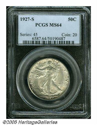 <B>1927-S<50C> MS64 PCGS.</B></I> The 1927-S half dollar is a scarce issue in spite of its rather substantial mintage (for the time) of 2.39 million pieces. This is an especially lustrous example that shows average definition in the centers. Mostly gray-brilliant with light, speckled russet toning around the margins.