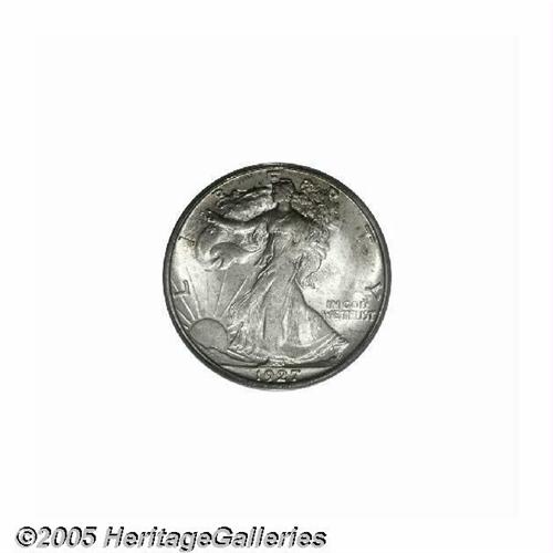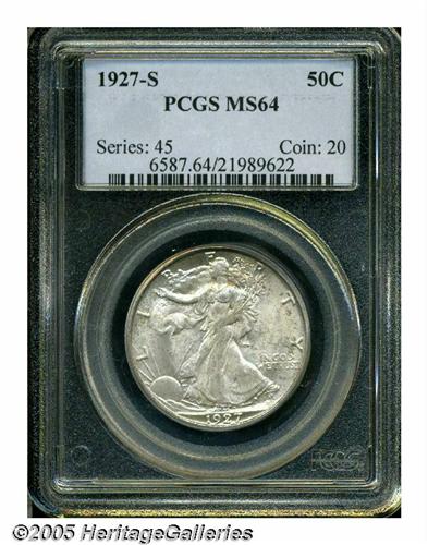 <B>1927-S<50C> MS64 PCGS.</B></I> The lack of Half Dollar production between 1923 and 1927 had an adverse effect on the 1927-S delivery. Since most of the 2.3 million coins produced in the latter year were desperately needed in the avenues of commerce, the San Francisco Mint rushed their production. As a result, most high grade survivors readily reveal striking incompleteness in select areas. In addition, the distribution of most examples directly into circulation meant that few Mint State examples were set aside for future generations of collectors. This moderately toned near-Gem is uncommonly well preserved with only a few wispy, barely distracting handling marks. The strike is typical for the date with soft definition over the central highpoints.