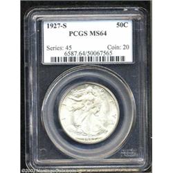 <table><tr><td><TABLE cellSpacing=0 cellPadding=0 width="100%" bgColor=#000000 border=0><TBODY> <TR><TD width="100%"><TABLE cellSpacing=1 cellPadding=3 width="100%" border=0><TBODY><TR><TD width="100%" bgColor=#79735c><FONT face=arial color=#ffffff size=3><B>Description</B> </FONT></TD></TR><TR><TD width="100%" bgColor=#ffffff><FONT face=arial size=2><B>1927-S 50C MS64 PCGS.</B></I> Even though 2.3 million pieces were struck of the 1927-S, most were not carefully produced and as a result it is one of the premier strike and condition rarities in the Walking Liberty series. It is also a condition rarity with pieces above the XF level scarce. This is a remarkably well struck example that has bright mint luster and is generally brilliant except for a few light dabs of golden patina on the obverse. </FONT></TD></TR></TBODY></TABLE></TD></TR></TBODY></TABLE><BR><A name=PricesRealized></A><TABLE cellSpacing=0 cellPadding=0 width="100%" bgColor=#000000 border=0><TBODY><TR><TD width="100%"><TABLE cellSpacing=1 cellPadding=3 width="100%" border=0><TBODY><TR><TD width="100%" bgColor=#79735c><A name=PR><FONT face=arial color=#ffffff size=3><B>Previous Prices from Heritage Auctions</B> </FONT></A></TD></TR><TR><TD bgColor=#f6f6ed><TABLE cellSpacing=0 cellPadding=0 width="100%" border=1><TBODY><TR><TD align=middle width="33%"><B>Date</B></TD><TD align=middle width="33%"><B>Service</B></TD><TD align=middle width="33%"><B>Price</B></TD></TR><TR bgColor=whitesmoke><TD width="33%"><B>01/14/2003</B></TD><TD width="33%">PCGS</TD><TD width="33%">$2,185.00</TD></TR><TR bgColor=whitesmoke><TD width="33%"><B>02/05/2002</B></TD><TD width="33%">PCGS</TD><TD width="33%">$2,185.00</TD></TR><TR bgColor=whitesmoke><TD width="33%"><B>02/20/2001</B></TD><TD width="33%">PCGS</TD><TD width="33%">$2,000.00</TD></TR><TR bgColor=whitesmoke><TD width="33%"><B>08/29/2000</B></TD><TD width="33%">ANACS</TD><TD width="33%">$2,150.00</TD></TR><TR bgColor=whitesmoke><TD width="33%"><B>09/20/2003</B></TD><TD width="33%">PCGS</TD><TD width="33%">$3,910.00</TD></TR><TR bgColor=whitesmoke><TD width="33%"><B>03/23/2003</B></TD><TD width="33%">PCGS</TD><TD width="33%">$2,530.00</TD></TR><TR bgColor=whitesmoke><TD width="33%"><B>03/23/2003</B></TD><TD width="33%">NGC</TD><TD width="33%">$2,300.00</TD></TR><TR bgColor=whitesmoke><TD width="33%"><B>03/23/2003</B></TD><TD width="33%">PCGS</TD><TD width="33%">$3,335.00</TD></TR><TR bgColor=whitesmoke><TD width="33%"><B>03/01/2003</B></TD><TD width="33%">PCGS</TD><TD width="33%">$2,472.50</TD></TR><TR bgColor=whitesmoke><TD width="33%"><B>11/23/2002</B></TD><TD width="33%">PCGS</TD><TD width="33%">$2,472.50</TD></TR><TR bgColor=whitesmoke><TD width="33%"><B>09/28/2002</B></TD><TD width="33%">PCGS</TD><TD width="33%">$1,955.00</TD></TR><TR bgColor=whitesmoke><TD width="33%"><B>06/08/2002</B></TD><TD width="33%">PCGS</TD><TD width="33%">$2,357.50</TD></TR><TR bgColor=whitesmoke><TD width="33%"><B>01/12/2002</B></TD><TD width="33%">ANACS</TD><TD width="33%">$1,840.00</TD></TR><TR bgColor=whitesmoke><TD width="33%"><B>11/15/2001</B></TD><TD width="33%">PCGS</TD><TD width="33%">$1,667.50</TD></TR><TR bgColor=whitesmoke><TD width="33%"><B>10/06/2001</B></TD><TD width="33%">PCGS</TD><TD width="33%">$2,012.50</TD></TR><TR bgColor=whitesmoke><TD width="33%"><B>10/06/2001</B></TD><TD width="33%">PCGS</TD><TD width="33%">$1,610.00</TD></TR><TR bgColor=whitesmoke><TD width="33%"><B>06/10/2000</B></TD><TD width="33%">PCGS</TD><TD width="33%">$1,955.00</TD></TR><TR bgColor=whitesmoke><TD width="33%"><B>08/13/1999</B></TD><TD width="33%">PCGS</TD><TD width="33%">$2,415.00</TD></TR><TR bgColor=whitesmoke><TD width="33%"><B>06/04/1999</B></TD><TD width="33%">PCGS</TD><TD width="33%">$2,127.50</TD></TR><TR bgColor=whitesmoke><TD width="33%"><B>01/08/1999</B></TD><TD width="33%">PCGS</TD><TD width="33%">$1,840.00</TD></TR><TR bgColor=whitesmoke><TD width="33%"><B>08/02/1997</B></TD><TD width="33%">PCGS</TD><TD width="33%">$1,610.00</TD></TR><TR bgColor=whitesmoke><TD width="33%"><B>06/01/1996</B></TD><TD width="33%">PCGS</TD><TD width="33%">$1,595.00</TD></TR><TR bgColor=whitesmoke><TD width="33%"><B>06/01/1996</B></TD><TD width="33%">NGC</TD><TD width="33%">$1,980.00</TD></TR><TR bgColor=whitesmoke><TD width="33%"><B>01/06/1996</B></TD><TD width="33%">PCGS</TD><TD width="33%">$2,090.00</TD></TR><TR bgColor=whitesmoke><TD width="33%"><B>08/19/1995</B></TD><TD width="33%">PCGS</TD><TD width="33%">$2,640.00</TD></TR><TR bgColor=whitesmoke><TD width="33%"><B>11/01/1995</B></TD><TD width="33%">PCGS</TD><TD width="33%">$2,090.00</TD></TR><TR bgColor=whitesmoke><TD width="33%"><B>01/01/1999</B></TD><TD width="33%">PCGS</TD><TD width="33%">$3,450.00</TD></TR><TR bgColor=whitesmoke><TD width="33%"><B>06/01/2000</B></TD><TD width="33%">PCGS</TD><TD width="33%">$1,725.00</TD></TR><TR bgColor=whitesmoke><TD width="33%"><B>03/21/2002</B></TD><TD width="33%">NGC</TD><TD width="33%">$3,680.00</TD></TR><TR bgColor=whitesmoke><TD width="33%"><B>03/21/2002</B></TD><TD width="33%">PCGS</TD><TD width="33%">$2,185.00</TD></TR><TR bgColor=whitesmoke><TD width="33%"><B>01/01/1998</B></TD><TD width="33%">PCGS</TD><TD width="33%">$2,200.00</TD></TR><TR bgColor=whitesmoke><TD width="33%"><B>06/01/1998</B></TD><TD width="33%">NGC</TD><TD width="33%">$1,650.00</TD></TR><TR bgColor=whitesmoke><TD width="33%"><B>01/01/1996</B></TD><TD width="33%">PCGS</TD><TD width="33%">$2,530.00</TD></TR><TR bgColor=whitesmoke><TD width="33%"><B>02/01/1999</B></TD><TD width="33%">PCGS</TD><TD width="33%">$2,300.00</TD></TR><TR bgColor=whitesmoke><TD width="33%"><B>01/01/1998</B></TD><TD width="33%">PCGS</TD><TD width="33%">$2,200.00</TD></TR><TR bgColor=whitesmoke><TD width="33%"><B>10/01/1998</B></TD><TD width="33%">PCGS</TD><TD width="33%">$1,870.00</TD></TR></TBODY></TABLE></TD></TR><TR><TD bgColor=#ffffff><FONT face=arial size=1 ?>PLEASE NOTE: All prices realized reflect the final hammer price PLUS the buyer's premium in auctions that charge a buyer'