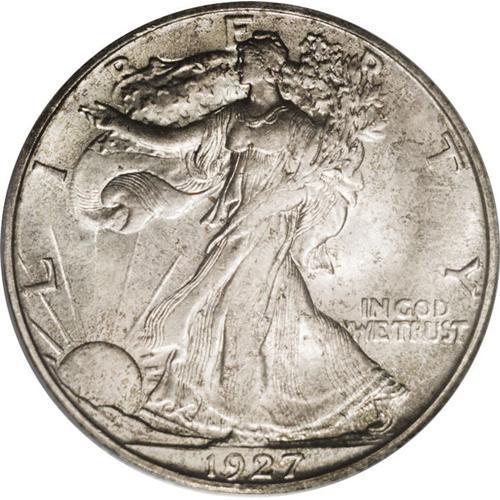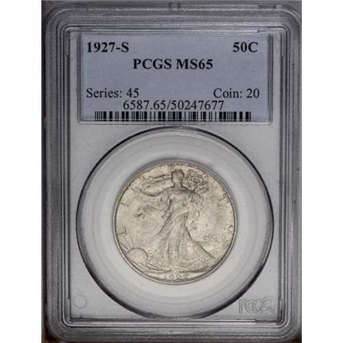 <B>1927-S<50C> MS65 PCGS.</B></I> No Half Dollars were struck in any of the mints in 1924, 1925, and 1926. Only 2.3 million pieces were produced in 1927 (all at the San Francisco mint), and most were heavily circulated because no halves had been struck since 1923. As a result, Mint State examples are quite scarce. Striking definition is also a problem on the '27-S, but this is a remarkably well defined coin for the issue. The mint luster is enhanced by a moderate coating of mottled olive-gray patina that lends a fully original appearance. A couple of small contact marks are mentioned on the eagle's wing. Population: 52 in 65, 6 finer (3/06). <BR><BR><B>Important notice:</B> Heritage usually auctions material at the rate of 200-250 lots per hour. On some occasions eBay Live bid software or the Internet may not be able to keep up with the pace of the auction. We recommend placing a realistic absentee bid now as insurance to avoid disappointment. Occasionally the auctioneer may eliminate or reject an eBay Live bid, and the auctioneer may also reopen a lot after the close of the eBay live bidding (usually because we missed an audience bid), and may reject your bid even if it shows you as the winning bidder. By bidding via eBay Live, you agree that Heritage may award the lot to another bidder at its sole discretion under the circumstances described above or any other reasonable circumstances. Since eBay bids are not shown to us until we open the lot on the floor, we treat those bids just like floor bids. In most cases the floor responds before the eBay bid is presented to us, due to Internet lag time, so for consistency we have made it a policy that floor bids are always considered first over tie eBay live bids. Also please note that all Heritage lots purchased through eBay Live carry a 20% Buyer's Premium. Please make sure you read the Terms and Conditions before you bid. This lot is being auctioned in conjunction with a live floor auction by Heritage Galleries & Auctioneers. All final auction and invoice information will be supplied by Heritage Galleries & Auctioneers, and all other information should be considered preliminary. Lot:2934 <BR><BR><B>Winning Notification and Billing:</B> After the FINAL session in this auction is complete, Heritage will send e-mail and snail mail invoices. This process normally takes several days. All final auction and invoice information will be supplied by Heritage Galleries & Auctioneers, and all other information should be considered preliminary. <BR><BR>This auction will be conducted on a live auction floor and over the Internet through eBay Live. If you choose to place an absentee bid, please take a moment to <font color='#0000ff'><u><a href='http://pages.ebay.com/liveauctions/help/before/laabsentee.html'>learn how eBay Live absentee bidding works</a></u></font><font color='#000000'>