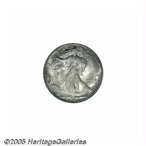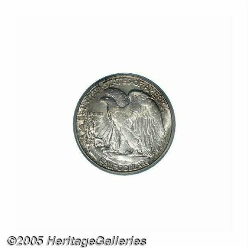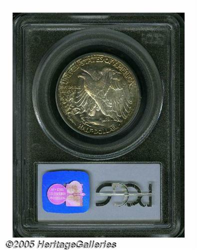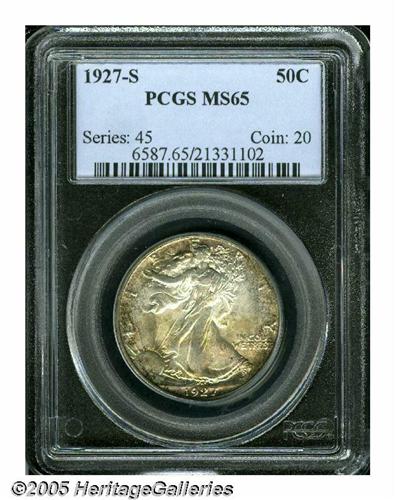 <B>1927-S<50C> MS65 PCGS.</B></I> Splendid apricot-gold and lilac hues enrich this lustrous tough date Gem, however, areas of brilliance are present on both sides. The surfaces are remarkably clean, even for the MS65 level, although slight softness of strike on the branch hand and skirt lines prevents a higher grade. An excellent candidate for a competitive Registry Set. Population: 48 in 65, 5 finer (5/05).