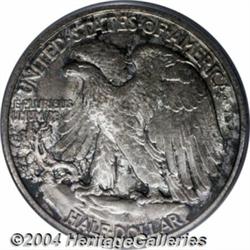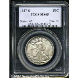 <B>1927-S<50C> MS65 PCGS.</B></I> A splendidly preserved '27-S Walker that combines shimmering, satiny luster with detail over the central devices that, while not totally full, is nothing short of remarkable for the issue. Almost mark-free surfaces are moderately toned with blushes of gray, gunmetal-blue, and reddish-gold patina on the obverse and reverse. Exceedingly difficult as a Gem. Population: 40 in 65, 6 finer (3/04). <BR><BR><B>Important notice:</B> Heritage usually auctions material at the rate of 200-250 lots per hour. On some occasions eBay Live bid software or the Internet may not be able to keep up with the pace of the auction. We recommend placing a realistic absentee bid now as insurance to avoid disappointment. Occasionally the auctioneer may eliminate or reject an eBay Live bid, and the auctioneer may also reopen a lot after the close of the eBay live bidding (usually because we missed an audience bid), and may reject your bid even if it shows you as the winning bidder. By bidding via eBay Live, you agree that Heritage may award the lot to another bidder at its sole discretion under the circumstances described above or any other reasonable circumstances. Since eBay bids are not shown to us until we open the lot on the floor, we treat those bids just like floor bids. In most cases the floor responds before the eBay bid is presented to us, due to Internet lag time, so for consistency we have made it a policy that floor bids are always considered first over tie eBay live bids. Also please note that all Heritage lots purchased through eBay Live carry a 20% Buyer's Premium. Please make sure you read the Terms and Conditions before you bid. </span></font></tr></table></td></tr></table>