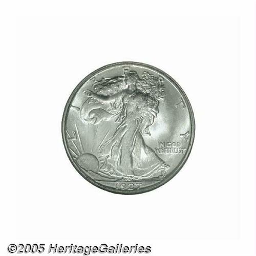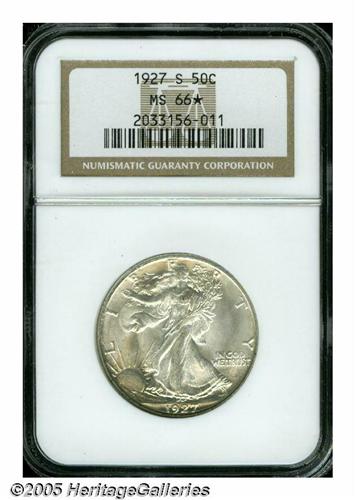 <B>1927-S<50C> MS66 <S NGC.</B></I> Only 2.3 million pieces were struck of the 1927-S half, making it one of the premier strike and condition rarities in the Walking Liberty series. Apparently most of the mintage entered the channels of commerce, as this issue is only really common in grades below the XF level. This is the second time we have handled this coin, the only MS66 example of the date we have ever offered, and this one comes with the coveted NGC <S designation. Very sharply struck on all the main devices--there may be a better struck example somewhere but we haven't seen it. This issue is also well known for its wholesome luster, but again, this coin shows the thickest mint frost imaginable, which is aided even more by die polish in the fields. As one might infer from the grade, this piece is also uncommonly clean. Population: 1 in 66 <S, 0 finer (6/05).<BR><I>From our July 2003 Baltimore Signature Sale.</B></I><BR><I>From The Robert Moreno Collection.</B></I>