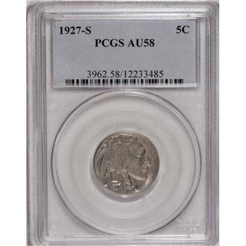 <B>1927-S 5C AU58 PCGS.</B></I> PCGS Population (83/524). NGC Census: (61/296). Mintage: 3,430,000. Numismedia Wsl. Price for NGC/PCGS coin in AU58: $250. (#3962)<BR><BR><B>Coin Engraver:</B> James E. Fraser<BR><BR><b>Shipping:</b> Coins & Currency (<a target="_blank" href="http://www.heritageauctions.com/common/shipping.php">view shipping information</a>)