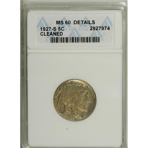 <B>1927-S 5C --Cleaned--ANACS. MS60 Details.</B></I> NGC Census: (0/278). PCGS Population (4/0). Mintage: 3,430,000. Numismedia Wsl. Price for NGC/PCGS coin in MS60: $475. (#3962)<BR><BR><b>Shipping:</b> Coins & Currency (<a target="_blank" href="http://www.heritageauctions.com/common/shipping.php">view shipping information</a>)