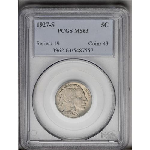 <B>1927-S<5C> MS63 PCGS.</B></I> Fairly well struck for this difficult date, with only localized weakness seen on the bison's tail, shoulder, and the Indian's braid. Essentially untoned, with good luster. <BR><BR><B>Important notice:</B> Heritage usually auctions material at the rate of 200-250 lots per hour. On some occasions eBay Live bid software or the Internet may not be able to keep up with the pace of the auction. We recommend placing a realistic absentee bid now as insurance to avoid disappointment. Occasionally the auctioneer may eliminate or reject an eBay Live bid, and the auctioneer may also reopen a lot after the close of the eBay live bidding (usually because we missed an audience bid), and may reject your bid even if it shows you as the winning bidder. By bidding via eBay Live, you agree that Heritage may award the lot to another bidder at its sole discretion under the circumstances described above or any other reasonable circumstances. Since eBay bids are not shown to us until we open the lot on the floor, we treat those bids just like floor bids. In most cases the floor responds before the eBay bid is presented to us, due to Internet lag time, so for consistency we have made it a policy that floor bids are always considered first over tie eBay live bids. Also please note that all Heritage lots purchased through eBay Live carry a 20% Buyer's Premium. Please make sure you read the Terms and Conditions before you bid. This lot is being auctioned in conjunction with a live floor auction by Heritage Galleries & Auctioneers. All final auction and invoice information will be supplied by Heritage Galleries & Auctioneers, and all other information should be considered preliminary. Lot:1099 <BR><BR><B>Winning Notification and Billing:</B> After the FINAL session in this auction is complete, Heritage will send e-mail and snail mail invoices. This process normally takes several days. All final auction and invoice information will be supplied by Heritage Galleries & Auctioneers, and all other information should be considered preliminary. <BR><BR>This auction will be conducted on a live auction floor and over the Internet through eBay Live. If you choose to place an absentee bid, please take a moment to <font color='#0000ff'><u><a href='http://pages.ebay.com/liveauctions/help/before/laabsentee.html'>learn how eBay Live absentee bidding works</a></u></font><font color='#000000'>