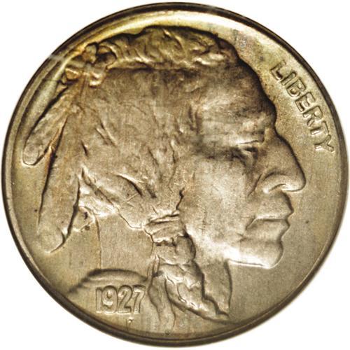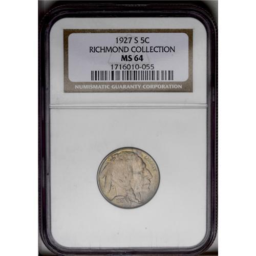 <B>1927-S<5C> MS64 NGC.</B></I> Ex: Richmond Collection. Due to the rather pronounced rarity of Gem condition coins from this issue, near-Gem examples like this one occupy a more prominent place in the Buffalo nickel marketplace than they might otherwise enjoy. The surfaces are boldly struck, with minor weakness noted on the letters of LIBERTY, and on the bison's head and tail. The satiny surfaces are moderately toned in gray and golden colors with accents of magenta and moss-green. A small, diagonal contact mark is mentioned midway across the bison's chest. A solid near-Gem example of this scarce date, which is hard to find better than VF. <BR><BR><B>Important notice:</B> Heritage usually auctions material at the rate of 200-250 lots per hour. On some occasions eBay Live bid software or the Internet may not be able to keep up with the pace of the auction. We recommend placing a realistic absentee bid now as insurance to avoid disappointment. Occasionally the auctioneer may eliminate or reject an eBay Live bid, and the auctioneer may also reopen a lot after the close of the eBay live bidding (usually because we missed an audience bid), and may reject your bid even if it shows you as the winning bidder. By bidding via eBay Live, you agree that Heritage may award the lot to another bidder at its sole discretion under the circumstances described above or any other reasonable circumstances. Since eBay bids are not shown to us until we open the lot on the floor, we treat those bids just like floor bids. In most cases the floor responds before the eBay bid is presented to us, due to Internet lag time, so for consistency we have made it a policy that floor bids are always considered first over tie eBay live bids. Also please note that all Heritage lots purchased through eBay Live carry a 20% Buyer's Premium. Please make sure you read the Terms and Conditions before you bid. This lot is being auctioned in conjunction with a live floor auction by Heritage Galleries & Auctioneers. All final auction and invoice information will be supplied by Heritage Galleries & Auctioneers, and all other information should be considered preliminary. Lot:1100 <BR><BR><B>Winning Notification and Billing:</B> After the FINAL session in this auction is complete, Heritage will send e-mail and snail mail invoices. This process normally takes several days. All final auction and invoice information will be supplied by Heritage Galleries & Auctioneers, and all other information should be considered preliminary. <BR><BR>This auction will be conducted on a live auction floor and over the Internet through eBay Live. If you choose to place an absentee bid, please take a moment to <font color='#0000ff'><u><a href='http://pages.ebay.com/liveauctions/help/before/laabsentee.html'>learn how eBay Live absentee bidding works</a></u></font><font color='#000000'>