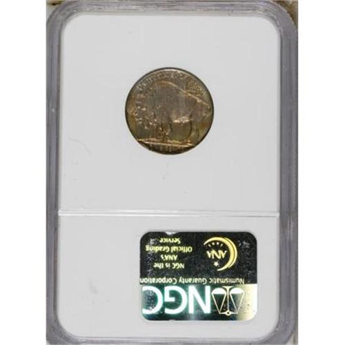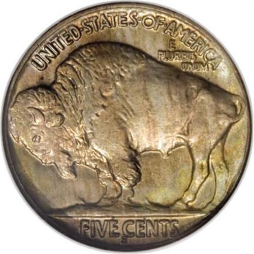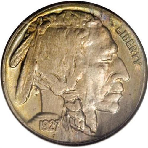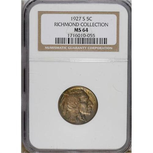 <B>1927-S 5C MS64 NGC.</B></I> Ex: Richmond Collection. David Lange (2000) notes that the 1927-S "... is genuinely rare in choice and gem condition." This near-Gem possesses pleasing luster with a coating of iridescent pastel rainbow patina. Well struck, except for minor softness in the hair on the bison's head. A couple of small darker toning spots are noted on each side.<BR><BR><b>Shipping:</b> Coins & Currency (<a target="_blank" href="http://www.heritageauctions.com/common/shipping.php">view shipping information</a>)