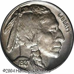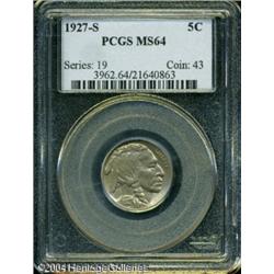 1927-S 5C MS64 PCGS. Due to the rather pronounced <B>1927-S 5C MS64 PCGS.</B></I> Due to the rather pronounced rarity of Gem condition coins from this issue, near-Gem examples like this one occupy a more prominent place in the Buffalo nickel marketplace than they might otherwise enjoy. The surfaces are boldly struck, with minor weakness noted on the letters of LIBERTY, and on the bison's head and tail. The satiny surfaces seem to be mark-free and are lightly toned. A solid near-Gem example of this scarce date, which is hard to find better than VF. <BR><BR><B>Important notice:</B> Heritage usually auctions material at the rate of 200-250 lots per hour. On some occasions eBay Live bid software or the Internet may not be able to keep up with the pace of the auction. We recommend placing a realistic absentee bid now as insurance to avoid disappointment. Occasionally the auctioneer may eliminate or reject an eBay Live bid, and the auctioneer may also reopen a lot after the close of the eBay live bidding (usually because we missed an audience bid), and may reject your bid even if it shows you as the winning bidder. By bidding via eBay Live, you agree that Heritage may award the lot to another bidder at its sole discretion under the circumstances described above or any other reasonable circumstances. Since eBay bids are not shown to us until we open the lot on the floor, we treat those bids just like floor bids. In most cases the floor responds before the eBay bid is presented to us, due to Internet lag time, so for consistency we have made it a policy that floor bids are always considered first over tie eBay live bids. Also please note that all Heritage lots purchased through eBay Live carry a 20% Buyer's Premium. Please make sure you read the Terms and Conditions before you bid. This lot is being auctioned in conjunction with a live floor auction by Heritage Galleries & Auctioneers. All final auction and invoice information will be supplied by Heritage Galleries & Auctioneers, and all other information should be considered preliminary. Lot:5598