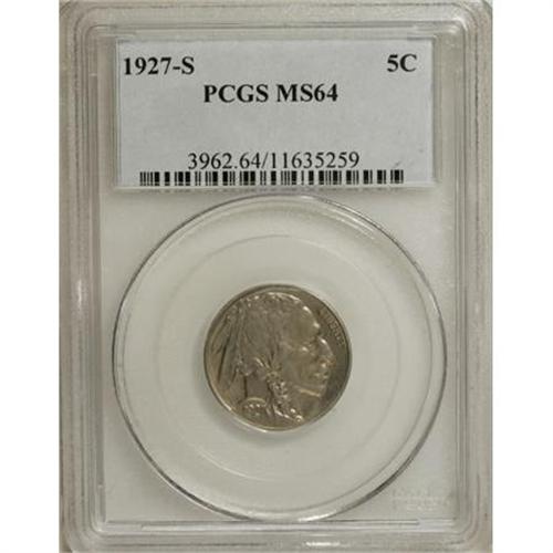 <B>1927-S 5C MS64 PCGS.</B></I> Appealing lilac-gold and aqua tones blend over the surfaces of this appealing near-Gem, with good luster and a decent strike, albeit not a bold one. Lange notes that the 1927-S is "genuinely rare in choice and gem condition." PCGS has certified only 20 coins at the next level.<BR><BR><B>Coin Engraver:</B> James E. Fraser<BR><BR><b>Shipping:</b> Coins & Currency (<a target="_blank" href="http://www.heritageauctions.com/common/shipping.php">view shipping information</a>\)