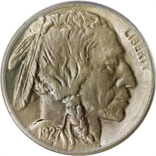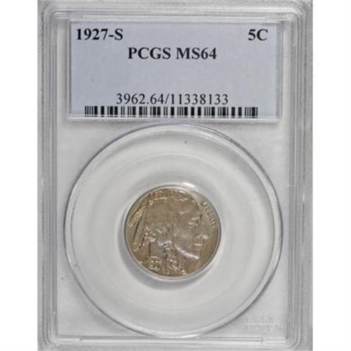 <B>1927-S 5C MS64 PCGS.</B></I> A satiny near-Gem example, exhibiting pale gray-gold color with lilac and iridescent toning on both sides. Dave Bowers described the MS64 grade as the "Optimal Collecting Grade" for the '27-S. A trademark of Whitman Publishing Company, the Optimal Collecting Grade for each issue provides an indication of the best value, after considering several factors. We hope that future editions of <I>A Guide Book of Buffalo and Jefferson Nickels</B></I> will actually inform the readers of the various factors that are considered.<BR><BR><B>Coin Engraver:</B> James E. Fraser<BR><BR><b>Shipping:</b> Coins & Currency (<a target="_blank" href="http://www.heritageauctions.com/common/shipping.php">view shipping information</a>)