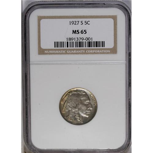 <B>1927-S<5C> MS65 NGC.</B></I> This Gem specimen is a remarkable match for the 1926-D nickel described above, with deep gray color surrounded by pale gold, rose, and blue toning. It is sharply struck with every detail fully defined. The fields are satiny and almost prooflike, as if to suggest a specimen appearance. Although the mintage was quite generous, with well over three million pieces struck, most examples entered circulation and an example in any Mint State grade is elusive. Gem quality coins are essentially impossible to locate. Census: 11 in 65, 1 finer (6/06).